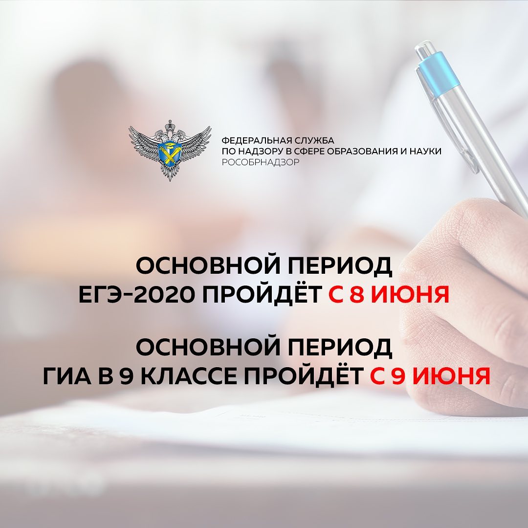 27.03.2020Сроки проведения ЕГЭ и ОГЭ переносятся. Об этом сегодня объявил министр просвещения Сергей Кравцов.⠀Экзамены для 11 классов начнутся с 8 июня, для 9 классов — с 9 июня. Такое решение принято в связи со складывающейся эпидемиологической обстановкой и объявлением следующей недели нерабочей.⠀Проект нового расписания сейчас корректируется и будет отправлен в регионы в ближайшие дни вместе с разъяснениями об организации работы.